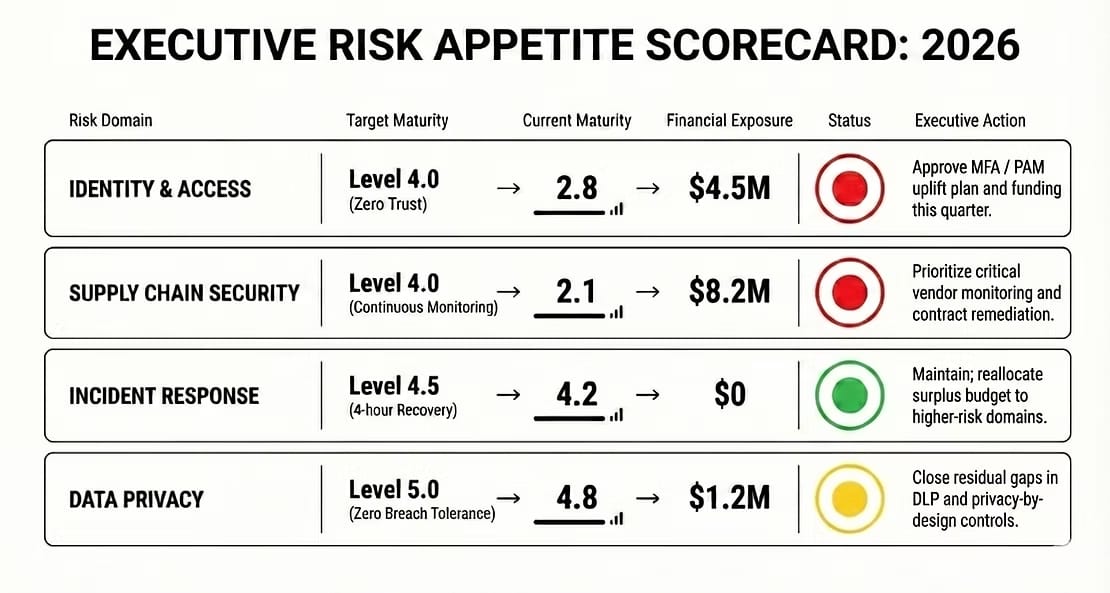 "Our identity and access controls are at Maturity 2.8. Our board-approved appetite demands Level 4.0. The gap represents $4.5 million in potential loss exposure. Here's the investment required to close it."